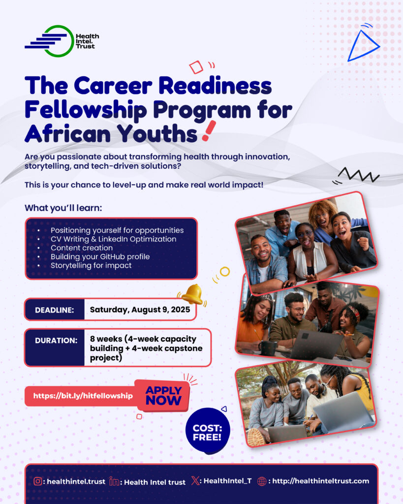 Thank you for your interest in The Career Readiness Fellowship Program 2025. The 8-week fellowship is a unique program organised by Health Intel Trust to equip passionate health entrepreneurs across Africa with essential tools, skills and mentorship needed to thrive at the intersection of healthcare and technology.